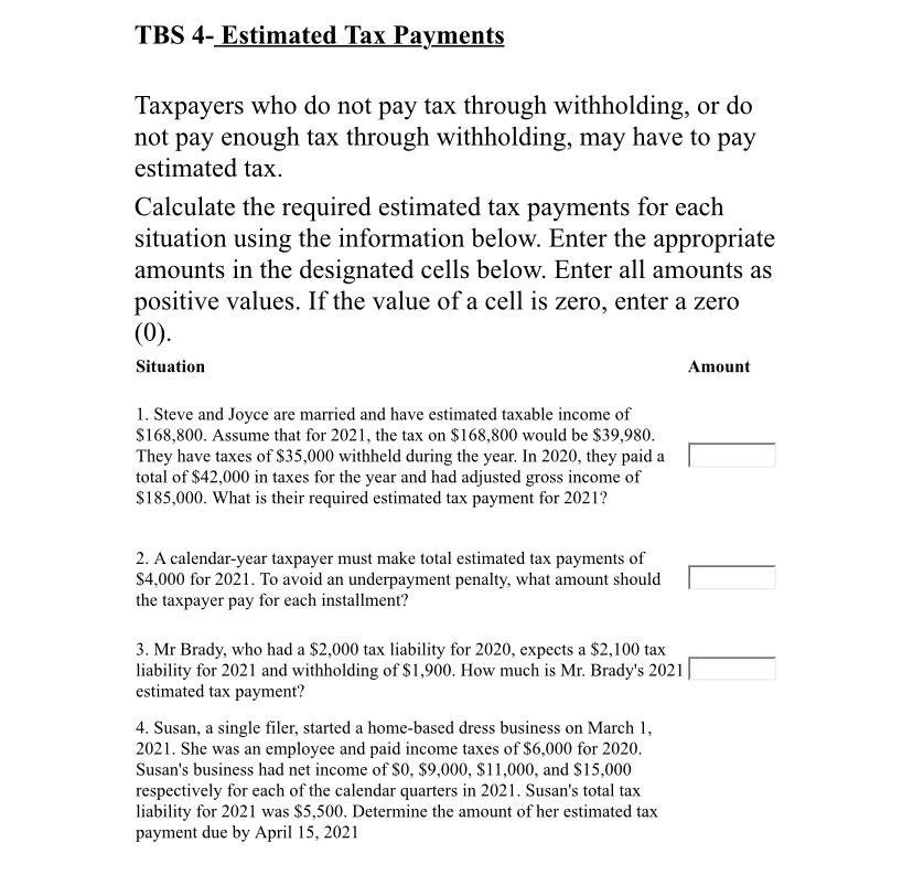 Solved Tbs 4 Estimated Tax Payments Taxpayers Who Do Not Chegg Com